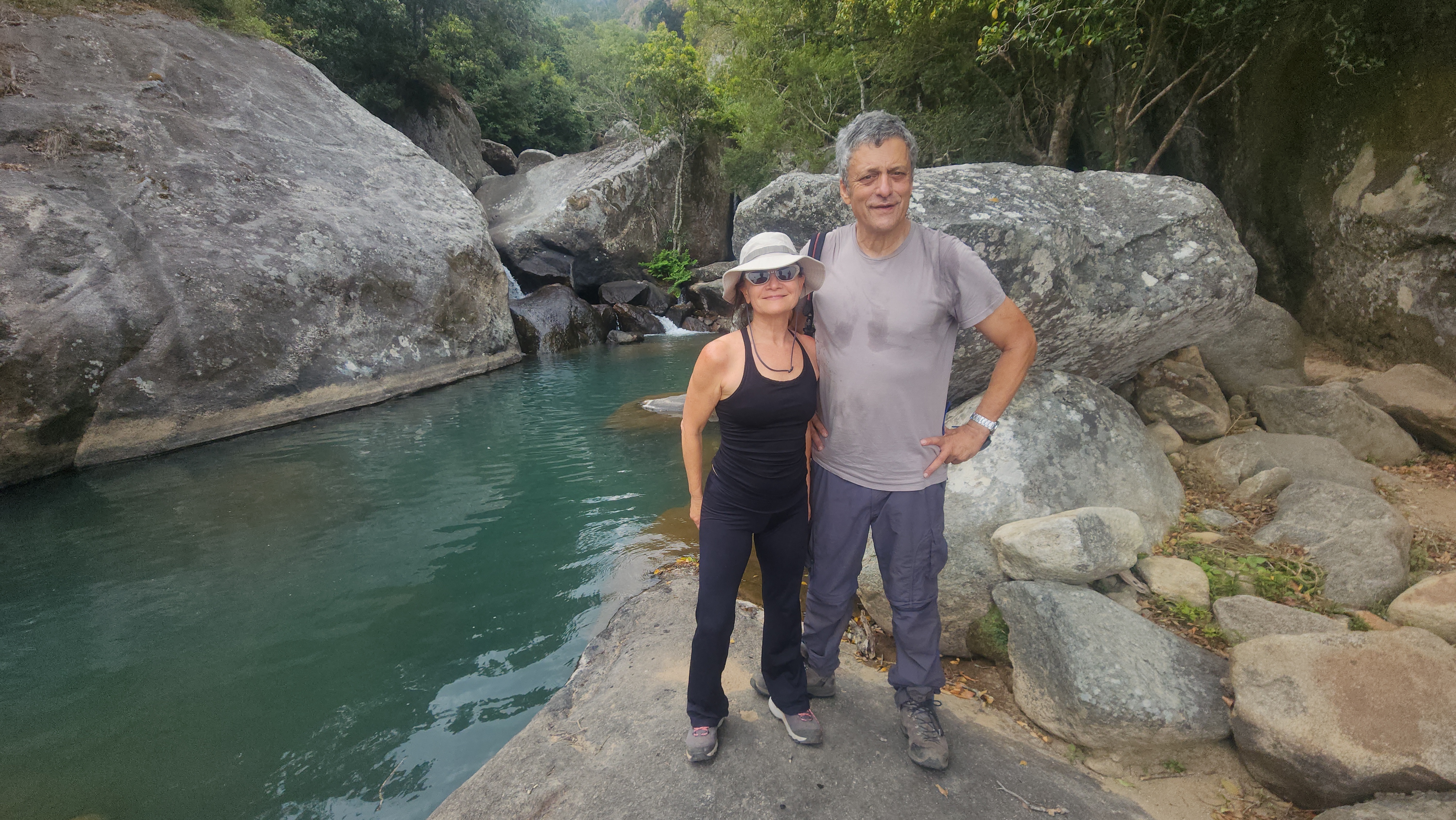 התחלנו ללכת במרומי ההר, שהתרומם בתלילות מעל שדות התה. החלנו לטפס בשביל נוח, כשמולנו מזדקר ההר, שצורתו כצורת שד. גם אלה שנדו בראשם נוכח האסוציאציות ה"כחולות" שלי, נאלצו להודות שאני צודק. מעת לעת נראו אנשים מקומיים, נושאים על גבם ערימה של עצי הסקה. בימים הבאים נראה רבים כאלה. את המחיר משלם היער ובעצם כולנו. לאחר כשעה וחצי של הליכה, הגענו למפל מים, הנשפך לבריכה טבעית גדולה, מוקפת בבולדרים ענקיים של גרניט. האמיצים קפצו למים הקרים. האמיצים מאד שחו עד למפל. הייתר הסתפקו בבריכות הצדדיות, שם המים הרדודים יחסית התחממו בקרינת השמש. המשכנו לטפס בשביל תלול למדי, עד לבריכה טבעית נוספת.