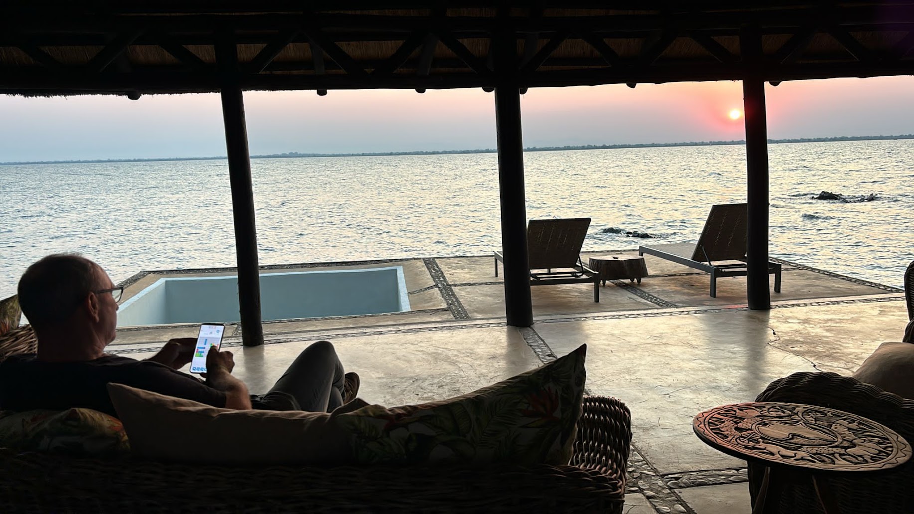 מה עשינו שם? לא הרבה: צפייה בציפורים, שיט בקאנו, הליכה ברגל סביב האי, שם חלפנו על פני שני עצי באובב שהתחברו לעץ ענק. תצפית מראש ההר על הנוף תוך לגימת מים קרים מצידנית שהונחה שם קודם על יד צוות הלודג'. מפגש עם לטאות נילוס צבעוניות להפליא. שחייה. בהיה באגם ובדייגים החותרים בו, אגב שתיית קפה והאזנה להמיית היונים, על רקע שמים ורודים בטרם זריחה, "הורדת השמש" (Sundown) עם כוס משקה, כשהשמים מצטבעים באדום של שקיעה, מסג' מפנק. ניגוד רב עצמה לחוויות הדרך. זמן גם למפגש חברתי, טיפולי שרירים אצל בקי, מדיטציה אצל סיגל. בוקר אחרון בטיול, הסנפת השקט. עוד מעט מתעוררים מהחלום. בראשית הייתה אפריקה.