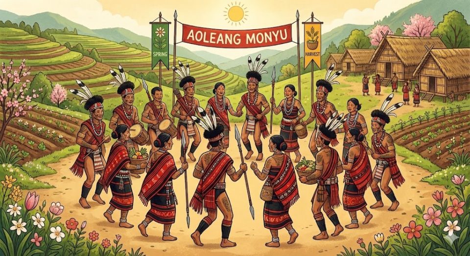 אולאנג-מוניו (Aoleang Monyu) נחגג בשבוע הראשון באפריל. זהו חג האביב וסוף עונת הזריעה, הנחשב לחשוב ביותר בשנה. הפסטיבל מלווה בריקודים המוניים, תלבושות ססגוניות, הצגות לוחמים, וטקסי ברכה על היבול הבא. זהו הזמן בו כפרי הקוניאק רבים פותחים את שעריהם למבקרים, והאווירה היא חגיגית במיוחד.